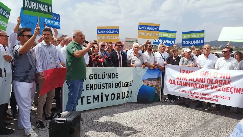 Bursa İznik Gölü, geçtiğimiz hafta Resmi Gazete’de yayımlanan bir kararla birlikte yok olma tehlikesiyle karşı karşıya. AKP’li Cumhurbaşkanı Tayyip Erdoğan’ın imzasıyla, Albayrak Grubu’na ait Varaka Kağıt Fabrikası için İznik Gölü’ne 350 metre mesafede 2550 metrekarelik alan özel endüstri bölgesi ilan edildi. Yayımlanan karara karşı bugün DOĞADER ve Bursa Kent Konseyi’nin çağrısıyla düzenlenen eyleme Nilüfer Kent Konseyi, Bursa Barosu, Ziraat Mühendisleri Odası Bursa Şubesi, Kayın Ormanı Derneği, CHP Orhangazi İlçe Başkanlığı, Bursa Milletvekilleri Hasan Öztürk, Orhan Sarıbal, Kayıhan Pala ve Selçuk Türkoğlu da katılım gösterdi.