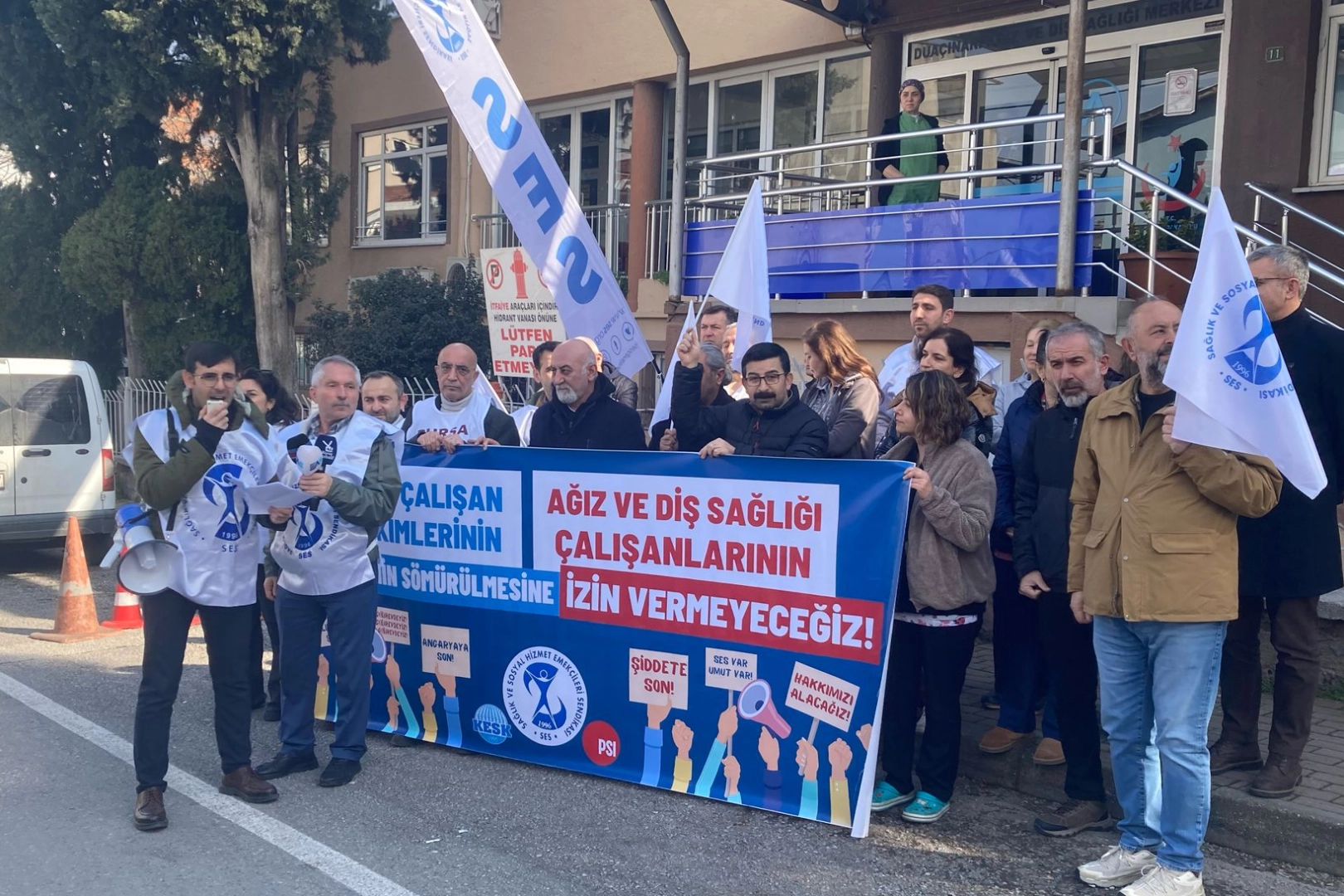 Duaçınarı Ağız ve Diş Sağlığı Merkezi önünde yapılan açıklamayı SES Bursa Şubesi Eş Başkanı Alican Özden okudu.