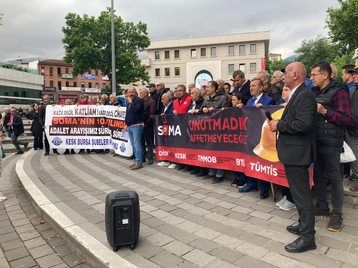301 maenciyi hayattan koparan Soma maden faciasının üzerinden 10 yıl geçti. KESK Bursa Şubeler Platformu tarafından Şehreküstü Meydanı'nda düzenlenen basın açıklamasında, "Soma’yı unutmayacağız, unutturmayacağız! Gerçek sorumlular yargılanana, gerçek anlamda hesap sorulana kadar Soma için adalet arayışımızı sürdüreceğiz!" ifadeleri kullanıldı.