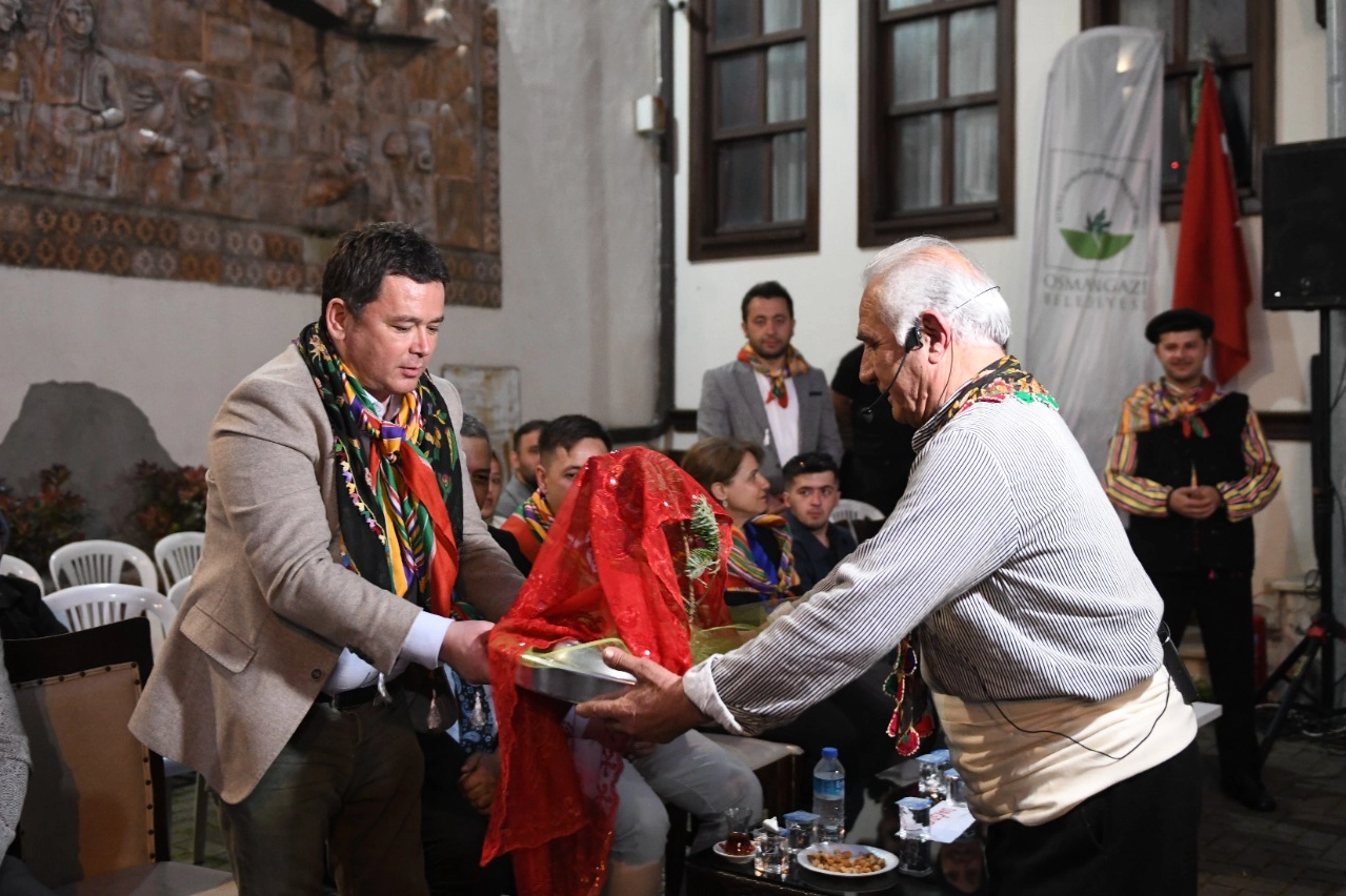 “Yeni kuşakların bu gelenekleri bilmesini istiyoruz”Osmangazi Belediye Başkanı Erkan Aydın, kına gecesinde yaptığı konuşmada, “Osmangazi Belediyesi olarak 20 yıldır düzenlediğimiz Osman Gazi’yi Anma ve Bursa’nın Fetih Günü Etkinlikleri ile geleneksel köy düğünü ve kına gecesi eğlencesini günümüzde yaşatıyoruz. Böyle köy düğünleri ve kına geceleri maalesef artık yapılmıyor. Gençlerimiz, ekonomik sıkıntılardan dolayı artık düğün dahi yapamaz oldu. Geleneklerimiz ve göreneklerimiz yaşasın diye Osman Gazi’yi Anma ve Bursa’nın Fetih Günü Etkinlikleri’nde köy düğünü ve köy kınası etkinliklerine yer veriyoruz. Şehir hayatı içerisinde unutulan gelenekleri, örf ve adetleri yaşatmak istiyoruz. Yeni kuşakların da bu gelenekleri tanımasını, bilmesini arzuluyoruz. Pazar günü Soğukpınar Mahallesi’nden gelin aldıktan sonra Çaybaşı Mahallesi’nde yapacağımız köy düğünü ile kültürümüze ait çok eski bir geleneği günümüze taşıyacağız. Emeği geçen herkese ayrı ayrı teşekkür ediyorum” dedi.