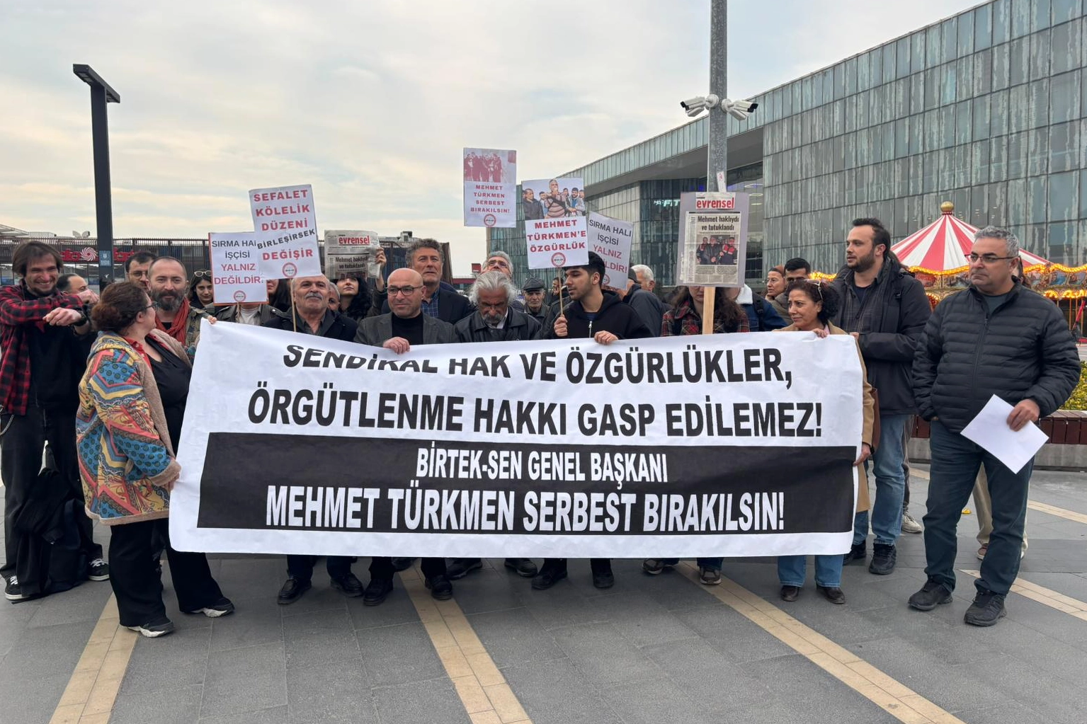 Kent Meydanı’nda bir araya gelen Emek ve Demokrasi Güçleri BİRTEK-SEN Genel Başkanı Mehmet Türkmen'in tutuklanmasını protesto ederek Türkmen’in serbest bırakılmasını istedi.