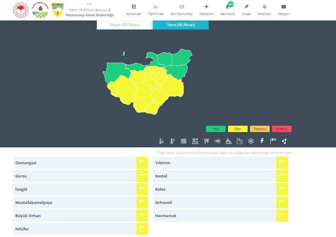 Meteoroloji Genel Müdürlüğü'nden yapılan açıklamada, Büyükorhan, Gürsu, Harmancık, İnegöl, Keles, Kestel, Mustafakemalpaşa, Nilüfer, Orhaneli, Osmangazi, Yıldırım ilçelerinde Salı günü saat 12.00'dan itibaren başlayarak 22.00'a kadar süreceği tahmin edilen uyarıda şu cümlelere yer verildi: "Rüzgârın, güney yönlerden İç Ege ile Göller Yöresi'nde kuvvetli (50-70 km/sa), Marmara'nın güneyi ile Kıyı Ege'de fırtına ve zaman zaman kuvvetli fırtına (60-90 km/sa) şeklinde esmesi beklendiğinden ağaç ve direk devrilmesi, soba ve baca gazı kaynaklı zehirlenme riski, çatı uçması ve ulaşımda aksamalar gibi olumsuzluklara karşı dikkatli ve tedbirli olunması gerekmektedir".