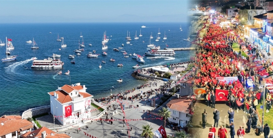Mudanya'da 29 Ekim Cumhuriyet Bayramı coşkusu, denizde cumhuriyet tekneleri, sokaklarda vatandaşın coşkulu yürüyüşüyle doruğa ulaştı. Gündüz mavi sulara, akşam ise kırmızı beyaz renklere bürünen Mudanya, Cumhuriyet'in 101. yılını büyük bir coşkuyla kutladı.