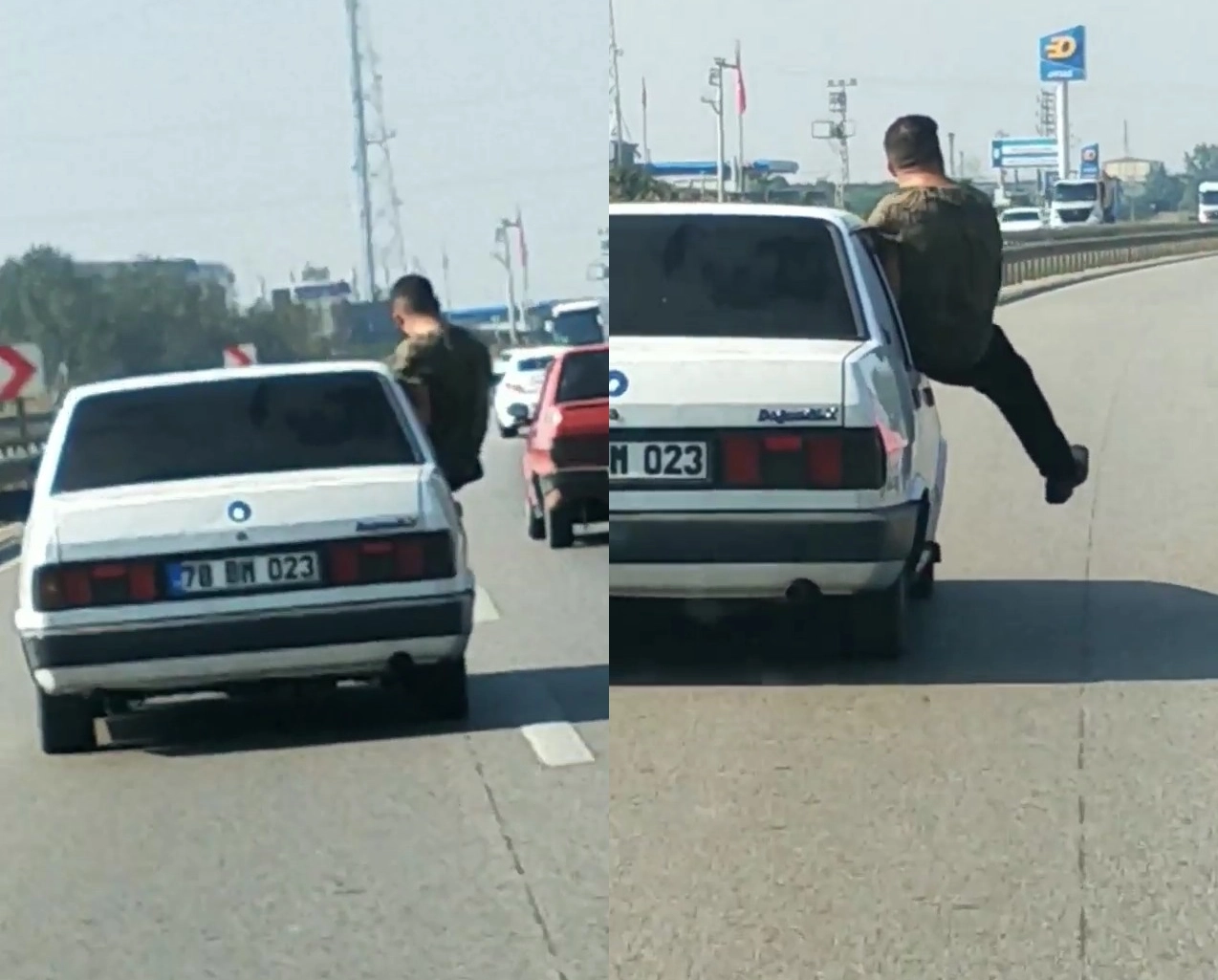 Bursa- Karacabey yolunda, 78 BM 023 plakalı otomobilin ön yolcu koltuğundaki camından aşağı sarkılan kimliği henüz belirlenemeyen bir kişi, sağ elini ve sağ ayağını dışarıya sarkıtarak yolculuk yaptı. Kendisini ve çevredeki tehlikeye atan kişi yaptığı farklı hareketlerle yürekleri ağza getirdi. Diğer sürücülerin tepkilerine aldırmadan davranışlarına devam eden kişi bir başka sürücünün cep telefonu kamerasına yansıdı.