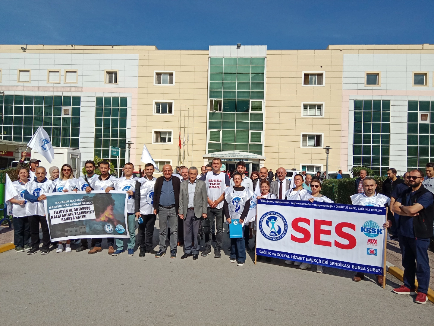 SES üyeleri Bursa Yüksek İhtisas Eğitim ve Araştırma Hastanesi önünde yaptığı açıklamada, ‘Soykırıma dur diyelim, içeride ve dışarıda barış mücadelesini yükseltelim’ çağrısında bulundu.