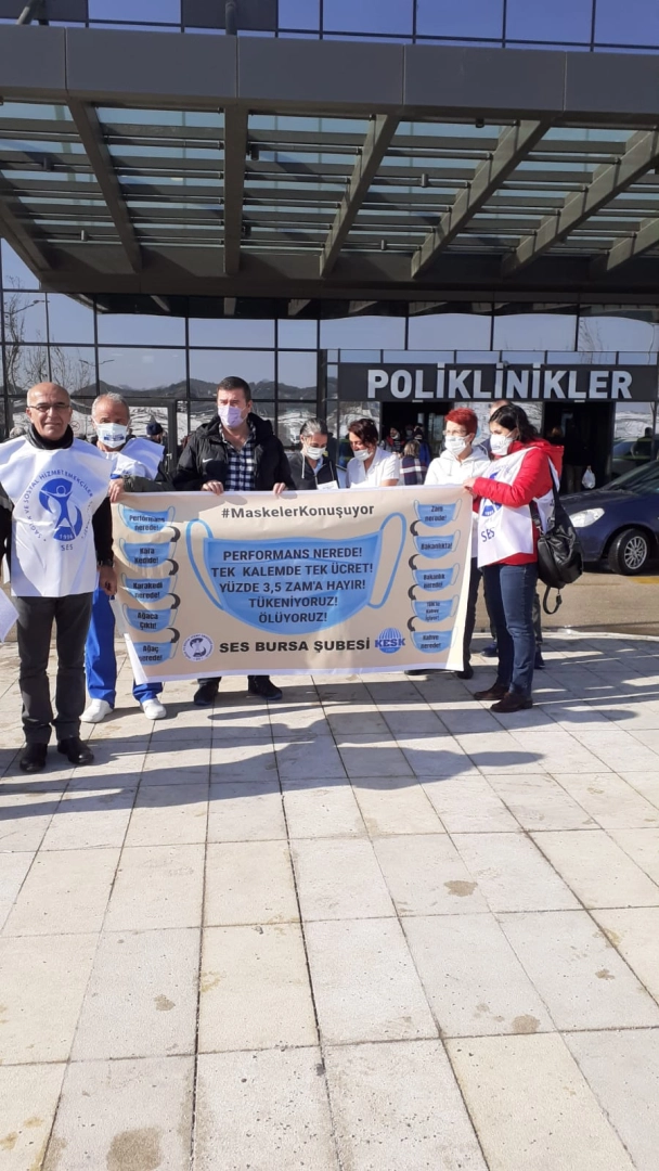 Sağlık ve Sosyal Hizmet Emekçileri Sendikası (SES) Bursa Şubesi, İktidar tarafından söz verildiği halde halen sağlık çalışanlarına özlük haklarının verilmemesinden dolayı Bursa Şehir Hastanesi önünde basın açıklaması gerçekleştirdi.
