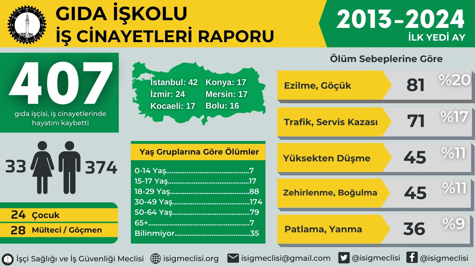 İşçi Sağlığı ve İş Güvenliği Meclisi, hazırladığı raporda son 11 yılda en az 407 gıda işçisi çalışırken yaşamını yitirdi. Raporda son 11 yılda Bursa'da en az 9 işçi çalışırken hayatını kaybetti.