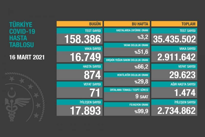Kovid-19'a dair Sağlık Bakanlığı verilerine göre son 24 saatte toplam vaka sayısına 16 bin 749, toplam hasta sayısına 874 kişi eklendi, 71 kişi hayatını kaybetti.