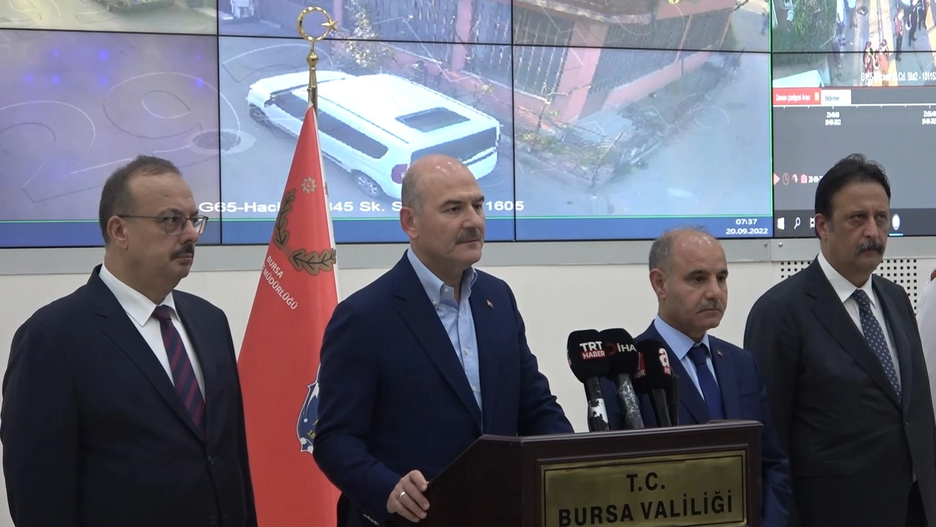Bursa’da sabah 05.00’te uyuşturucu operasyonuna giden polisleri uğurlayan Bakan Soylu, 2,5 saat içinde 132 kişinin gözaltına alınmasının ardından 7.30’da Kent Güvenlik Yönetim Sistemi’nde Emniyet Genel Müdürü Mehmet Aktaş, Bursa Valisi Yakup Canbolat, Emniyet Genel Müdürlüğü Narkotik Daire Başkanı, Bursa Emniyet Müdürü Tacettin Aslan ve Bursa İl Jandarma Komutanı Tümgeneral Tekin Aktemur ile birlikte açıklama yaptı.