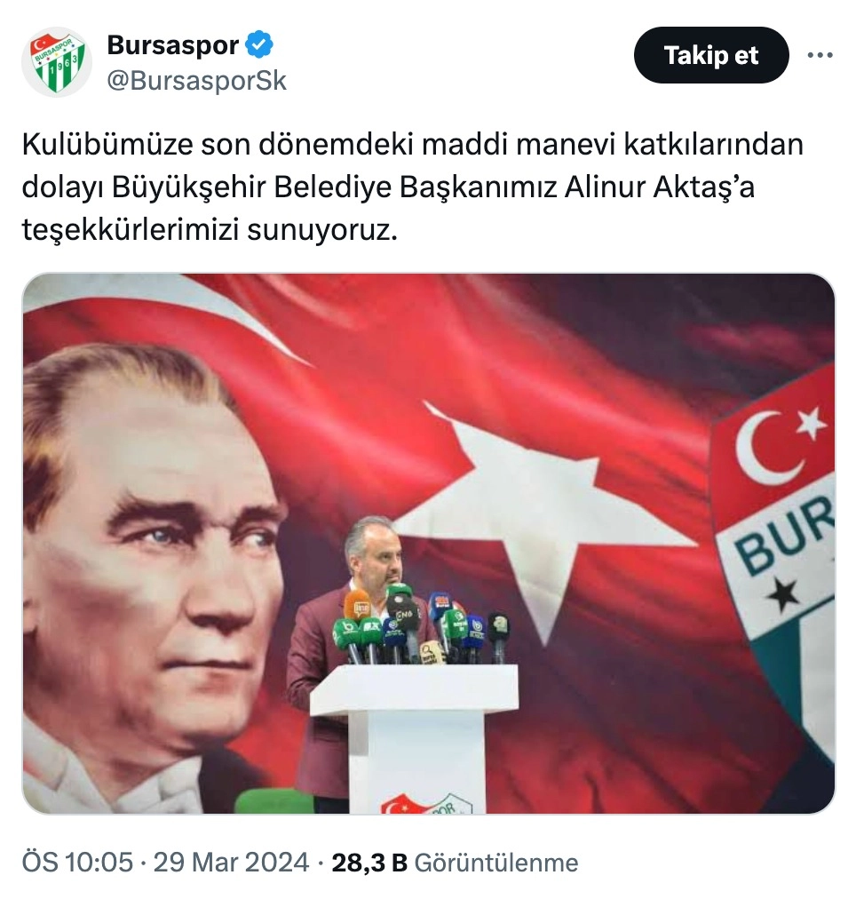 Yeşil beyazlı kulüp seçime 2 gün kala resmi internet sitesi ve sosyal medya hesabı üzerinden Bursa Büyükşehir Belediye Başkanı ve adayı Alinur Aktaş için teşekkür mesajı yayınladı.