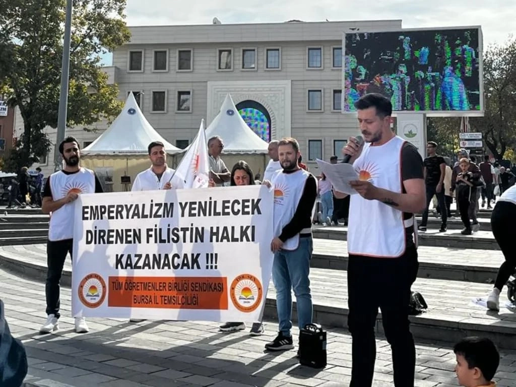 "Filistin meselesi üzerinden çocuklarımızı istismar ediliyor"Filistin meselesinde sendikamızın duruşunu, tutumunu bilerekten es geçen gerici, mezhepçi, faşist zihniyetin uzun yıllardır tanıdığımız taktik ve söylemiyle ‘Kefenden değil, dansözden rahatsız ol, Filistin’e destek amacı ile yapılan müsamere sizi neden rahatsız ediyor’ şeklindeki söylemlerle sendika temsilcimizi hedef gösteren Akit isimli gerici, cumhuriyet ve aydınlanma düşmanı tetikçi yayın halkın dini değerlerini istismar ederek, dini değerler üzerinden örgütlü ve organize bir şekilde linç kampanyasıyla suç bastırmaya çalışanlar daha düne kadar fetöcülere karşı olanları din karşıtı ilan eden Akit kadrosu TÖB-SEN Bursa İl Temsilcimiz Serkan Bebek’in, Türkiye kamuoyuna teşhir ettiği pedagojik cinayet olarak nitelediğimiz, öğrencilerimizde derin yaralar oluşturacak bu akıl ve bilim dışı uygulamalara çanak tutmaya çalışıyorlar ifadelerini kullanan Ezer, “Filistin halkının intifadalardan gelen direnişi ve mücadelesi haklı bir mücadeledir ve aynı zamanda meşrudur. Ayrıca Filistin halkının mücadele birikimini temsil eden güç Hamas değildir. Hamas’ın sivillere yönelik saldırısı da onaylanamaz. Filistinlilerin mülklerini gasbetmeye, yerlerine yerleşmeye devam eden İsrail karşısında haklı ve meşru bir savunma yapan bir halka dünyanın gözü önünde adeta bir soykırım uygulanıyor. Filistin topraklarının parça parça işgal edilmesi, Filistin halkının yerlerinden yurtlarından edilmesi kabul edilemez. Filistin’in intifadan gelen haklı direnişini selamlıyor, Filistin meselesi üzerinden çocuklarımızı istismar eden Akit gazetesi zihniyetini de açıkça kınıyoruz” dedi.