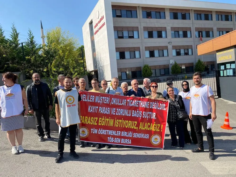 TÖBSEN, Bursa İl Milli Eğitim Müdürlüğünde yaşanan, taciz ve istismar skandalını ve zorunlu bağışı Macide Gazioğlu Kükürtlü Ortaokulu önünde protesto etti.