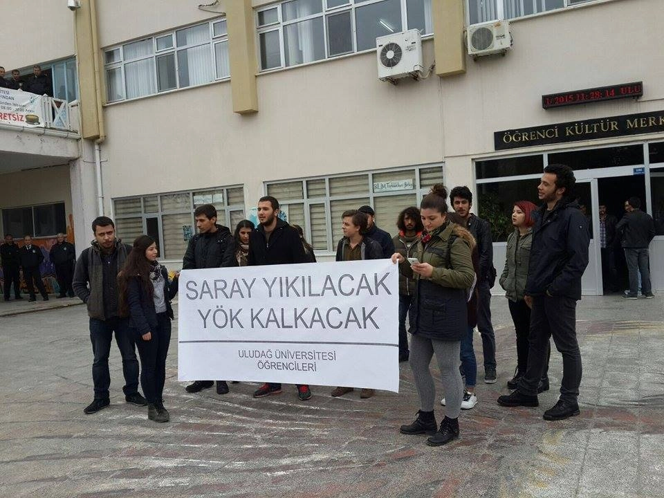 Darbenin üniversitelerdeki ayak sesi olan YÖK'ün kuruluşunun yıldönümünde Uludağ Üniversitesi öğrencileri YÖK'ü protesto etti. 6 Kasım 1981'de darbe sonrası üniversiteleri baskı altına almak için kurulan YÖK'e karşı bugün üniversiteliler sokaktaydı. Uludağ Üniversitesi öğrencileri Mediko Sosyal Tesisleri önünde buluşan öğrenciler AKP'ye ve ona hizmet eden YÖK'e karşı tüm üniversitelileri mücadeleye çağırdı. Uludağ Üniversitesi öğrencileri adına açıklama yapan Muhammed Ali Aytaç, Erdoğan'ın başkan olmak için tüm ülkede başlattığı savaşa şahit olduklarını ve muhalif olan herkesi susturmaya çalıştığını söyledi. Aytaç durumun üniversitelerde de farklı olmadığını belirterek, "Erdoğan, darbe kurumu olan ve bugün AKP'ye hizmet eden YÖK ve Erdoğan'ın başkanlık hayalleri için öldürülen arkadaşlarımızın hesabını sorarken, Erdoğan yandaş rektörleri aracılığıyla üniversitelere polis sokmaktan, ÖGB'lerle öğrencilere saldırmaktan geri durmuyor." dedi. Aytaç, üniversiteliler olarak rektörlerin Erdoğan'ın peşinden gitmemeleri gerektiğini belirterek, "Saraya, sarayın YÖK'üne ve yandaş rektörlerine karşı barışı ve özgürlüğü savunmaya devam edeceğiz." şeklinde konuştu.