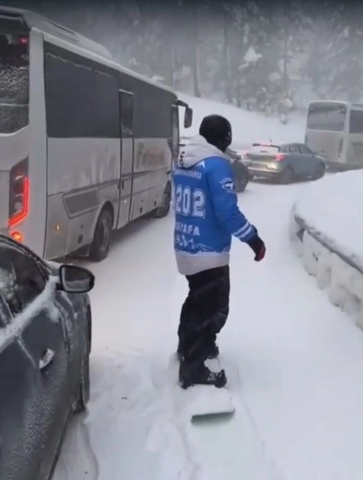 Uludağ'da etkili olan kar yağışı nedeniyle kapanan yolda 25 kilometrelik trafik oluştu. Öte yandan kapanan yolda kayak takımları ile kayarak şehir merkezine inmeye çalışan vatandaşlar ise kameraya yansıdı.