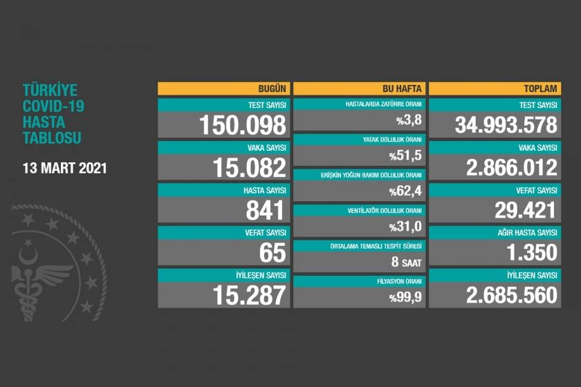 Sağlık Bakanlığı verilerine göre Türkiye'de son 24 saatte Kovid-19 vaka sayısına 15 bin 82 kişi eklenirken hasta sayısına 841 kişi eklendi. Koronavirüsten hayatını kaybedenlerin sayısı ise 65 oldu.