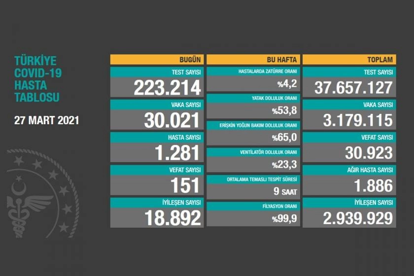 Türkiye'de son 24 saatte 30 bin 21 yeni vaka belirlendi, 151 kişi hayatını kaybetti. Toplam vaka sayısı 3 milyon 149 bin 94'e ulaştı, can kaybı ise 30 bin 772'ye çıktı.