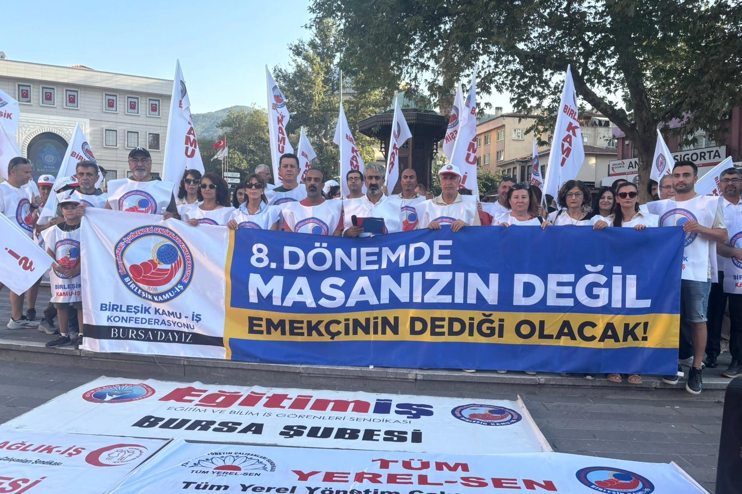 Bursa’da Birleşik Kamu-İş Konfederasyonu düşük ücret zammına karşı Fomara Meydanı'nda basın açıklaması gerçekleştirdi. Yapılan açıklamayı Birleşik Kamu-İş Konfederasyonu Bursa İl Başkanı Engin Yurdakul okudu.