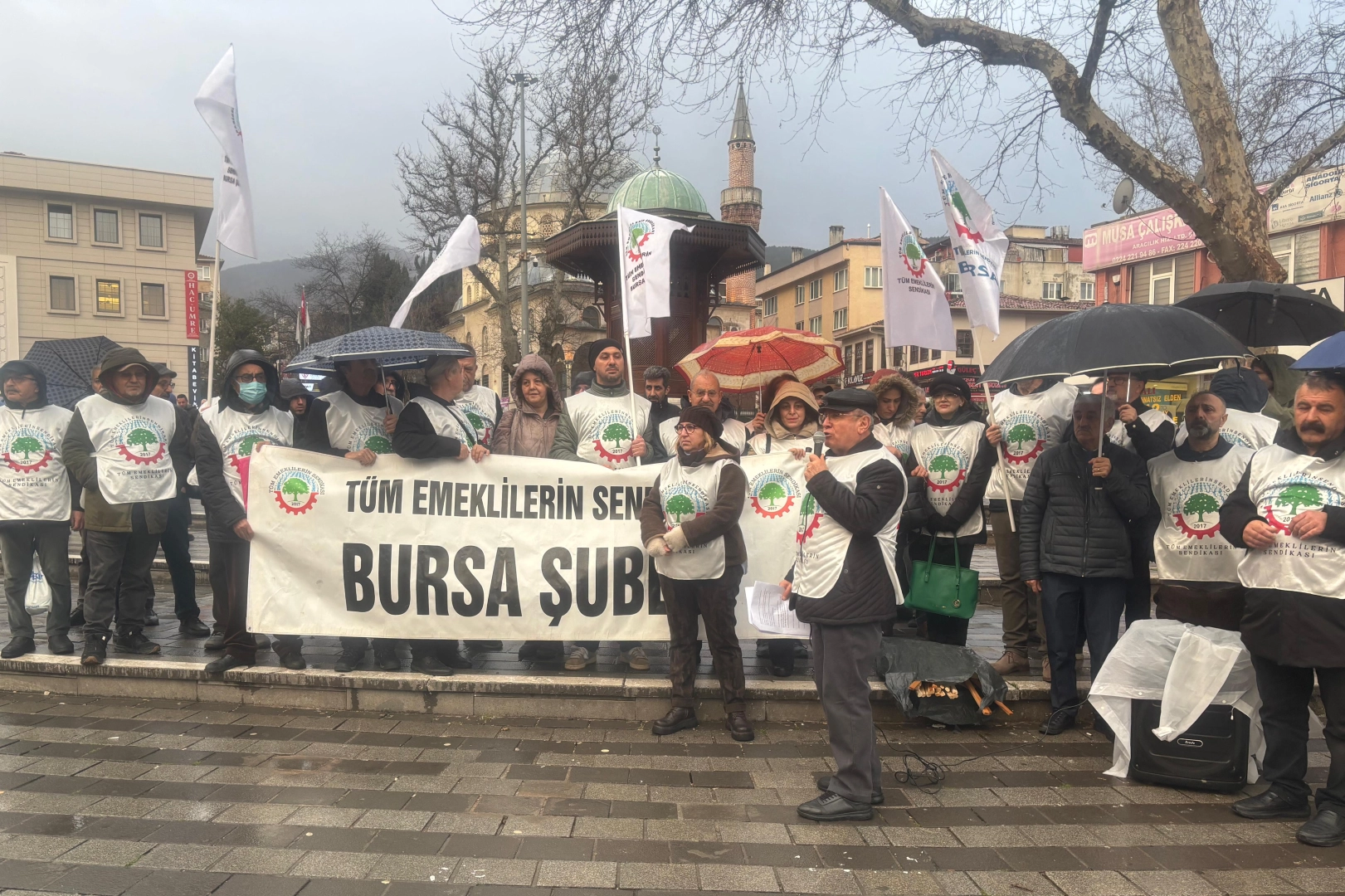 Bursa'da emekliler insanca yaşanacak ücret talebiyle Fomara Meydanı'nda basın açıklaması gerçekleştirdi.