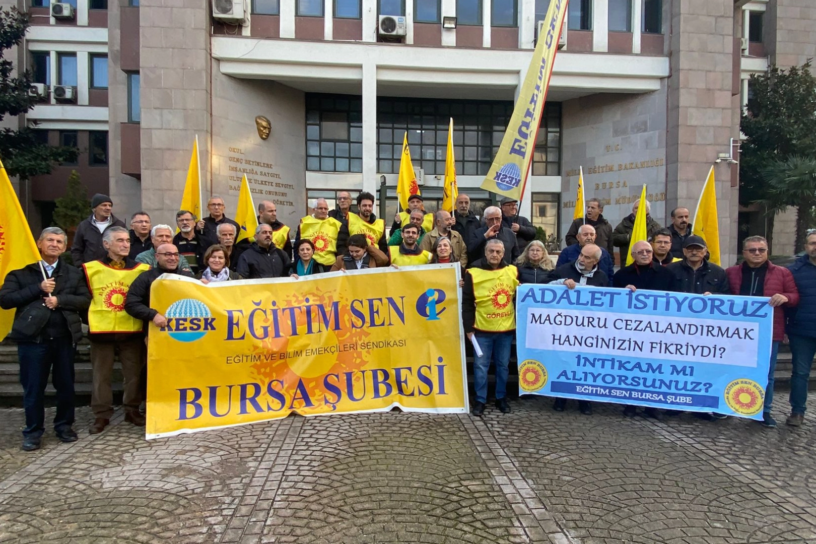 Mağdura ceza verilemez diyen Eğitim Sen Bursa Şubesi İl Milli Eğitim Müdürlüğü önünde basın açıklaması yaptı.