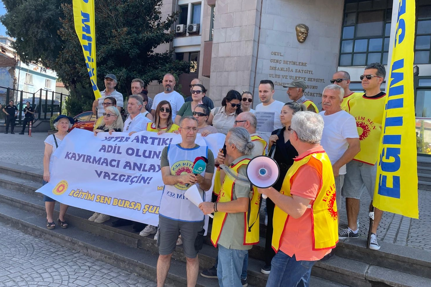 Bursa İl Milli Eğitim Müdürlüğü önünde bir araya gelen Eğitim Sen üyeleri adına yapılan açıklamayı EğitiM Sen Bursa Şube Başkanı Derviş Erdem okudu.