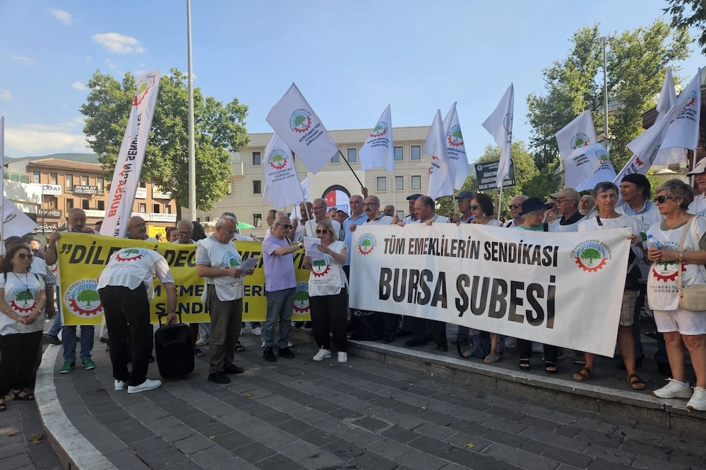 Tüm Emeklilerin Sendikası Bursa Şubesi, Bursa Fomara Meydanı'nda düzenledikleri basın açıklamasıyla, emeklilerin yaşam koşullarının iyileştirilmesini talep etti. Şube Başkanı Gülçin Ayyılmaz, ülkede 16 milyon, Bursa'da 700 bini bulan emeklilerin mesleki bilgi, iş geliştirme, iş yönetimi ve el emeği gibi gücümüzle üretimin gelişmesine katkı sunarken, diğer yandan da, tüketici olarak ekonomik çarkların kesintisiz dönmesinin, poliçe bedeli en düşük sigortasını oluşturduklarını söyledi. Ayyılmaz, "En geniş tüketici grubunu oluşturan biz EMEKLİLER, oranı yüzde 70'leri bulan, tüketimden alınan vergilerin de sigortasıyız. Yani; bizden kepçeyle aldıklarını, çay kaşığı ile geriye veren siyasal iktidarın her fırsatta söylediği gibi, ülke hazinesinin sırtında yük değil, tam tersine besleyen kaynağız. Siyasal iktidar hazinenin sırtındaki yükü gerçekten görmek istiyorsa; çeşitli teşviklerle beslediği, defalarca vergilerini affettiği, yıllar boyu ve çok ağır koşullarda biriktirilmiş ortak kamusal varlıkları, ve hem yer altı hem de yer üstü kaynakları peşkeş çektiği, gözü gibi koruduğu bir avuç azgın küfürbaza baksın." dedi.
