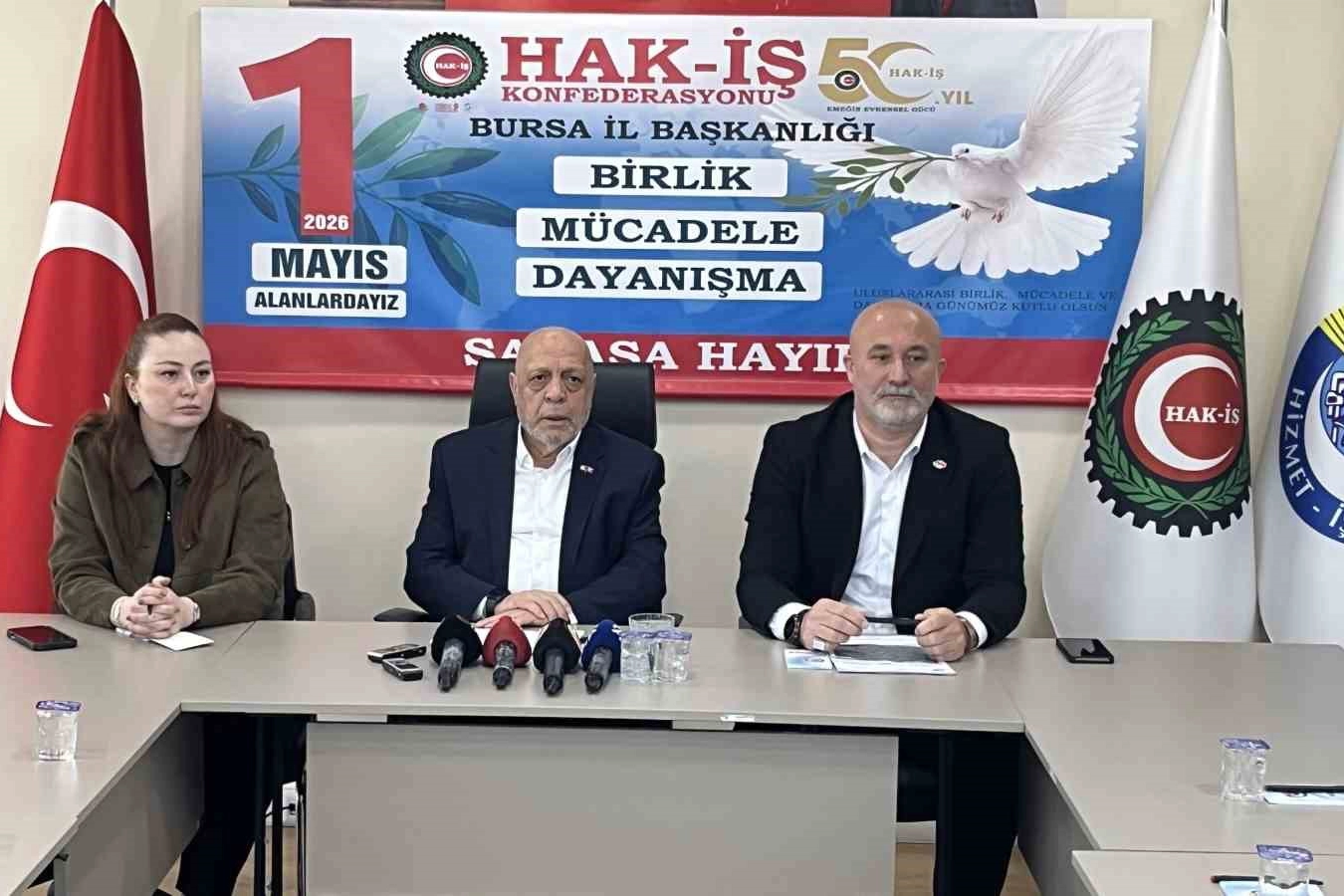 Hak-İş Başkanı ne demişti?Hak İşçi Sendikaları Konfederasyonu (Hak-İş) Genel Başkanı Mahmut Arslan, 1 Mayıs için bu yıl Bursa’da olacaklarını açıkladı. Arslan, "Bursa’ya aynı zamanda büyük bir katkı olacak. Gelen binlerce arkadaşımız Bursa esnafını da mutlu ediyor. Bütün restoranlarda rezervasyonlar yapılmıştır. Bursa’nın damak tadını bilen arkadaşlarımız Bursa’ya gelmek, alışveriş yapmak istiyor" dedi. Arslan, “1 Mayıs’ta kaos, kavga, çatışma, kriz ve gerginlik olmadı. Ülkenin değişik illerinden sabah erken saatlerde yola çıkarak 1 Mayıs etkinliklerinde halay çekerek, türkü söyleyerek, Mehter Marşı’yla, Kur’an-ı Kerim’le, dualarla ve birlik beraberliğimizi haykırdığımız görüntülerle 1 Mayıs etkinlikleri yaklaşık 15 yıldır bu çizgide devam ediyor.” ifadelerini kullandı.