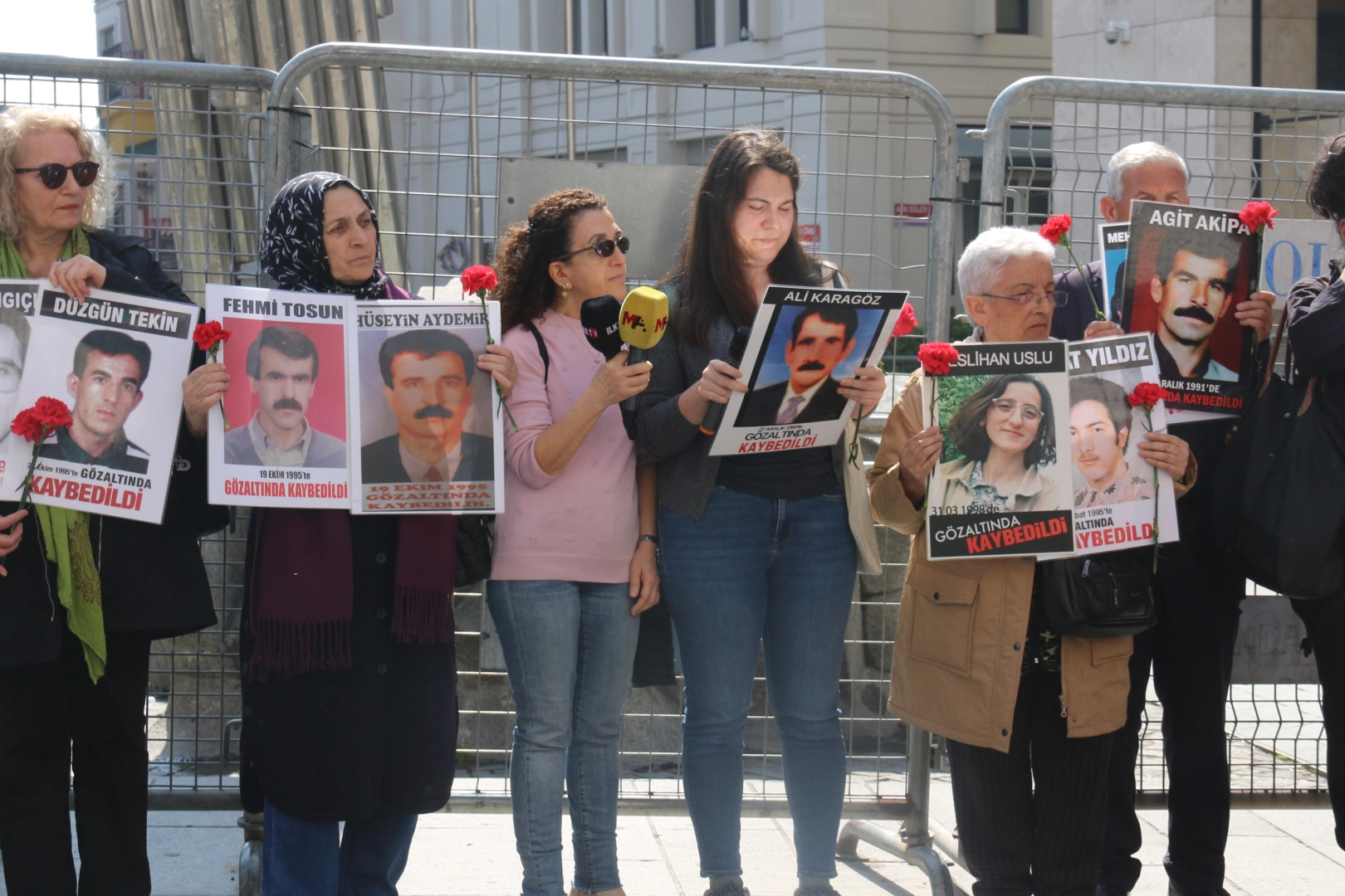 “Karanfillerimizi bırakacak bir mezar taşı gösterin”Ardında konuşan kayıp yakını Hanım Tosun, “Bugün arife günü herkes mezarlığa koşarken biz Galatasaray Meydanı’na geliyoruz. 30 senedir Galatasaray Meydanı’nda oturuyoruz dünya bizim sesimizi duydu, Türkiye bizim sesimizi duymadı. Yarın bayramdır ve herkes sevdiklerini mezarlarını ziyaret edecek bir karanfil bırakacak. Bize bir mezar taşı gösterin bu karanfillerimizi o mezarlıklara bırakalım" diye aktardı.