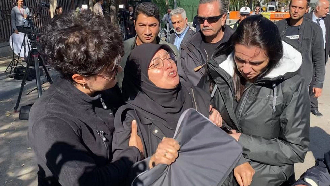 Dışişleri Bakanlığı önüne gelerek Filistin bayrağı açan ve 'Bebek Katili Blinken' sloganı atan bir kadın polis ekipleri tarafından gözaltına alındı. Kadın, ise “İçeride bir çocuk katili var. “Bebek Katili Blinken” sloganı attı.