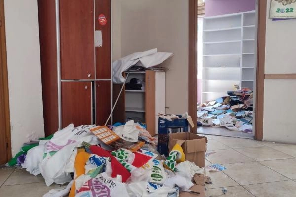 Arama sırasında kitaplıktaki yüzlerce kitap ile katledilen Deniz Poyraz ve Kemal Kurkut’un fotoğrafları ve adlarına düzenlenen futbol turnuvalarında verilen plaketler yere atıldı. Yeşiller ve Sol Gelecek Partisi (Yeşil Sol Parti), Halkların Demokratik Partisi (HDP) ve Emek ve Özgürlük İttifakı’na ait bayrak ve flamalar da yırtılarak etrafa saçıldı.
