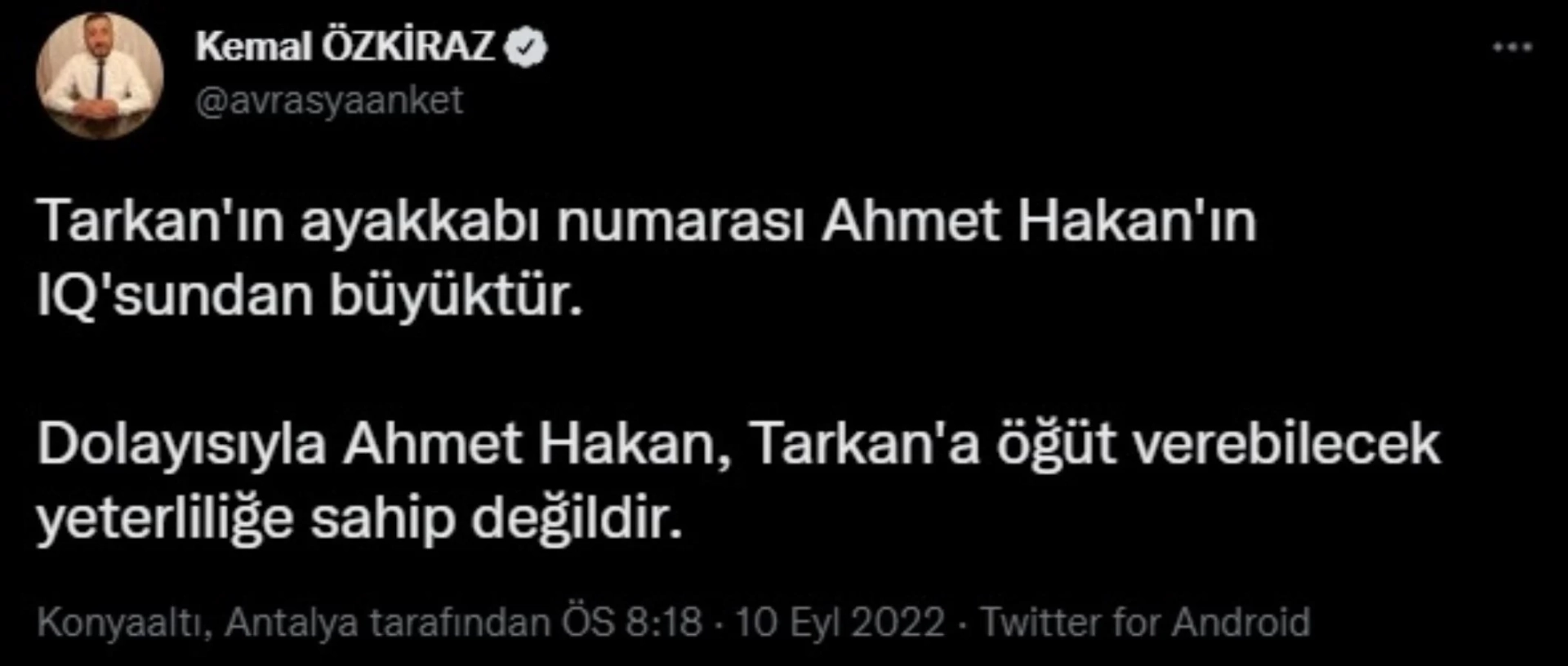 Avrasya Kamuoyu Araştırma Merkezi Başkanı Kemal Özkiraz, yazısında Tarkan'ı hedef alan Hürriyet Gazetesi Genel Yayın Yönetmeni Ahmet Hakan'a ilişkin olarak, "Tarkan'ın ayakkabı numarası Ahmet Hakan'ın IQ'sundan büyüktür" yorumunu yaptı.
