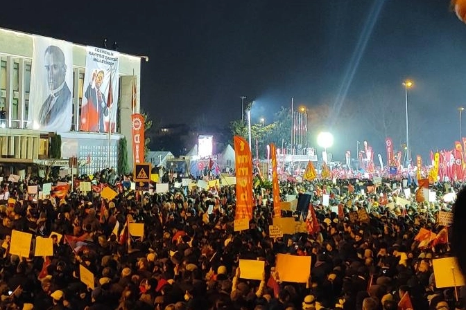 "Siz burada bir tarih yazıyorsunuz. 19 Mart 2025, 20 Mart, 21 Mart, 22 Mart, 23 Mart beş gece üst üste yarım milyon kişi, bir milyon kişiyi zorlayan rakamlarla bir meydanda toplanmak, hem de toplantı yasağına rağmen engellemelere rağmen toplu ulaşımın köprülerin kapanmasına rağmen inançla, kararlılıkla, azimle bu tek adam rejimine isyanla buralara geliyorsunuz. İyi ki varsınız. Bugün aslında hüznün günü, bugün kederin günü, bugün bir ayrılığın ilk günü gibi görülebilir. Ekrem Başkanımızı, can yoldaşımızı, Ekrem abimizi, Ekrem evladımızı, Ekrem kardeşimizi bizden alıp kopardılar, isyandayız, isyandayız, isyandayız."