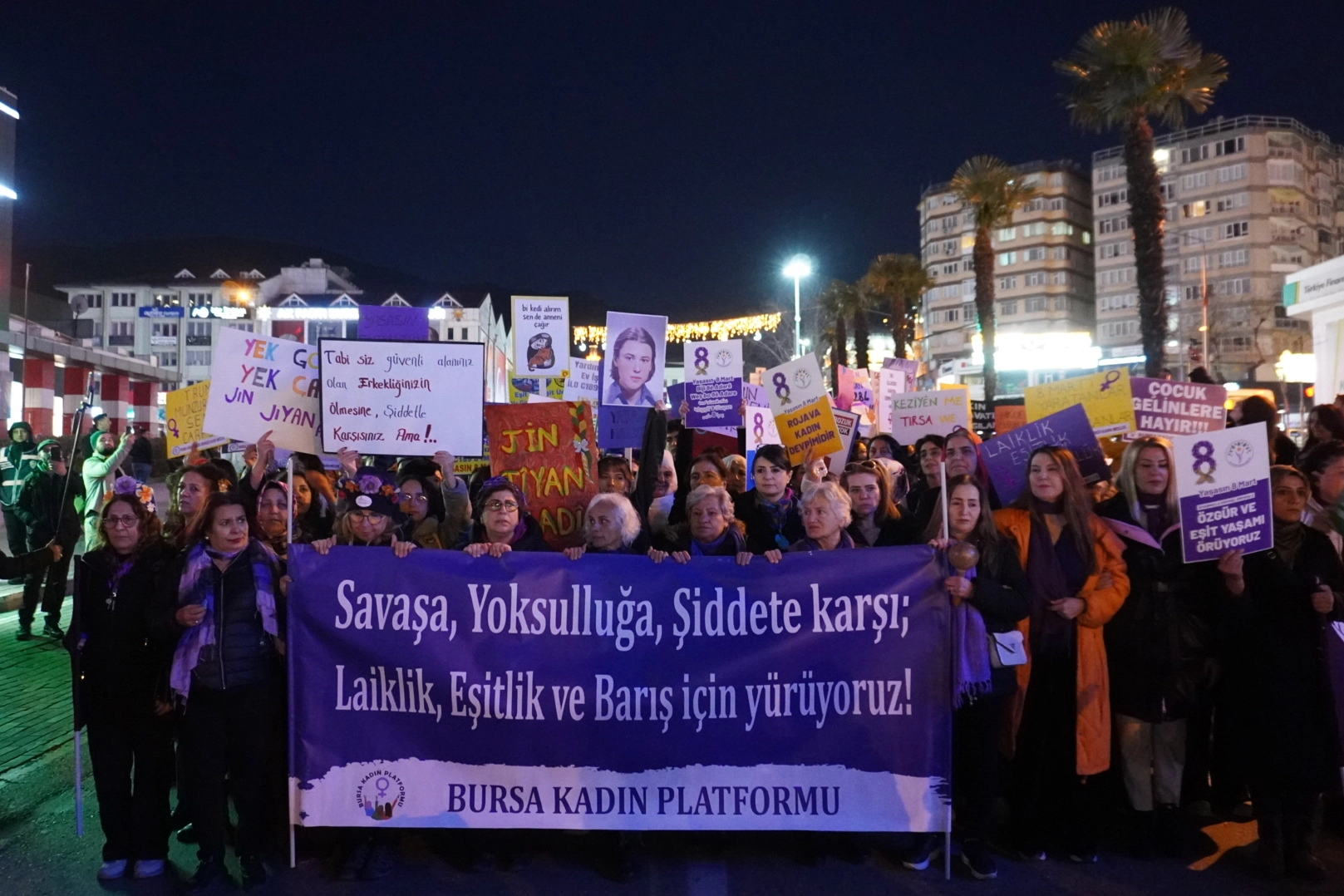Fomara Meydanı’nda toplanan kadınlar daha sonra “Kadınlar yürüyor, mücadele büyüyor” sloganlarıyla Kent Meydanı’na yürüyüşe geçti. Yürüyüş sırasında kadınların önüne polis barikatı kurulurken, kadınlar sloganlarla tepkilerini dile getirerek yürüyüşlerini sürdürdü ve Kent Meydanı’na doğru yürüdü.