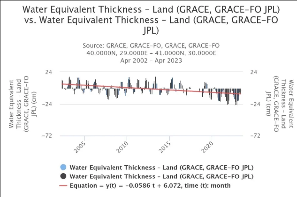 Yine, NASA'nın Gravity Recovery and Climate Experiment (ikiz Yerçekimi Verisi ve İklim Deneyi (GRACE) uyduları, dünyanın dört bir yanındaki büyük ölçekli yeraltı suyu değişimlerini izleyebilmektedir. Cargill'in de yer aldığı Grafik 2'deki koordinatlarda (Yeraltı Suyu İşletme Sahası) yeraltı suyunun sürekli azaldığı görülmektedir.(bkz. aşağıda Grafik-2)