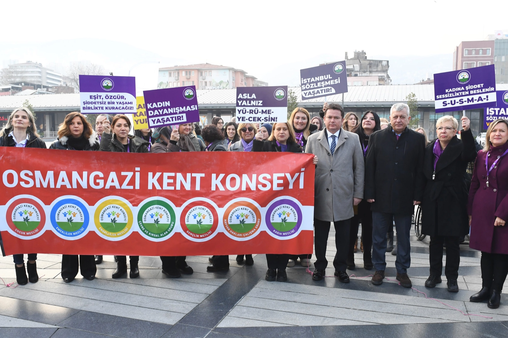 Kadına yönelik şiddetle mücadele konusunda toplumsal farkındalık oluşturmanın hedeflendiği basın açıklamasında, ‘eşit, özgür, şiddetsiz bir yaşamı birlikte kuracağız’ mesajı verildi. Osmangazi Meydanı’nda düzenlenen basın açıklamasına Osmangazi Belediye Başkanı Erkan Aydın, Osmangazi Kent Konseyi Başkanı Fatma Çil Yılmaz, Osmangazi Kent Konseyi Başkanı Sevgi Baysal, belediyedeki kadın personeller ile kadına yönelik şiddete dur diyen onlarca kadın katıldı.