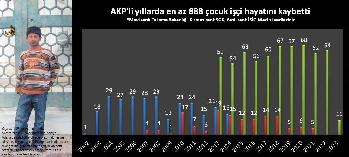 Bu noktada ‘çocuk işçi ölümleri’ni gösteren grafiği hazırlarken 2013 yılı evvelinde devletin açıkladığı en yüksek verileri esas aldık. Buna göre AKP’li yıllarda ‘en az’ 888 çocuk işçi çalışırken hayatını kaybetti...