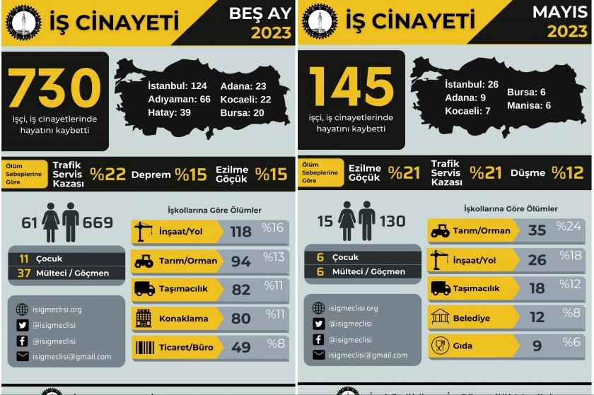 İSİG raporuna göre, 2023 yılının ilk beş ayında Ocak’ta 120, Şubat’ta 213, Mart’ta 130, Nisan’da 122 ve Mayıs’ta 145 olmak üzere en az 730 işçi hayatını kaybetti. En çok iş cinayeti inşaat-yol, tarım-orman, taşımacılık ve konaklama sektörlerinde yaşandı.