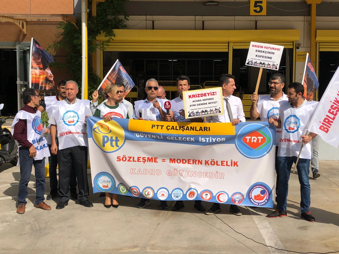 Bileşik Kamu-İş'e bağlı Güven Haber Sen PTT çalışanlarının kötü çalışma koşulları ve artan baskılar nedeniyle Bursa Beşevler PTT Başmüdürlüğü önünde basın açıklaması yaptı.