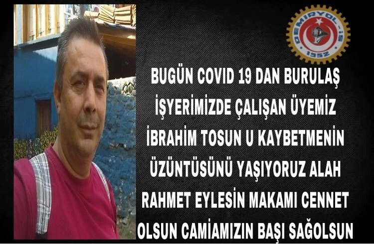 Demiryol-İş Bursa Çalışanları sayfasından yapılan açıklamada, “Bugün Covid-19’dan BURULAŞ işyerimizde çalışan üyemiz İbrahim Tosun’u kaybetmenin üzüntüsünü yaşıyoruz.” denildi.
