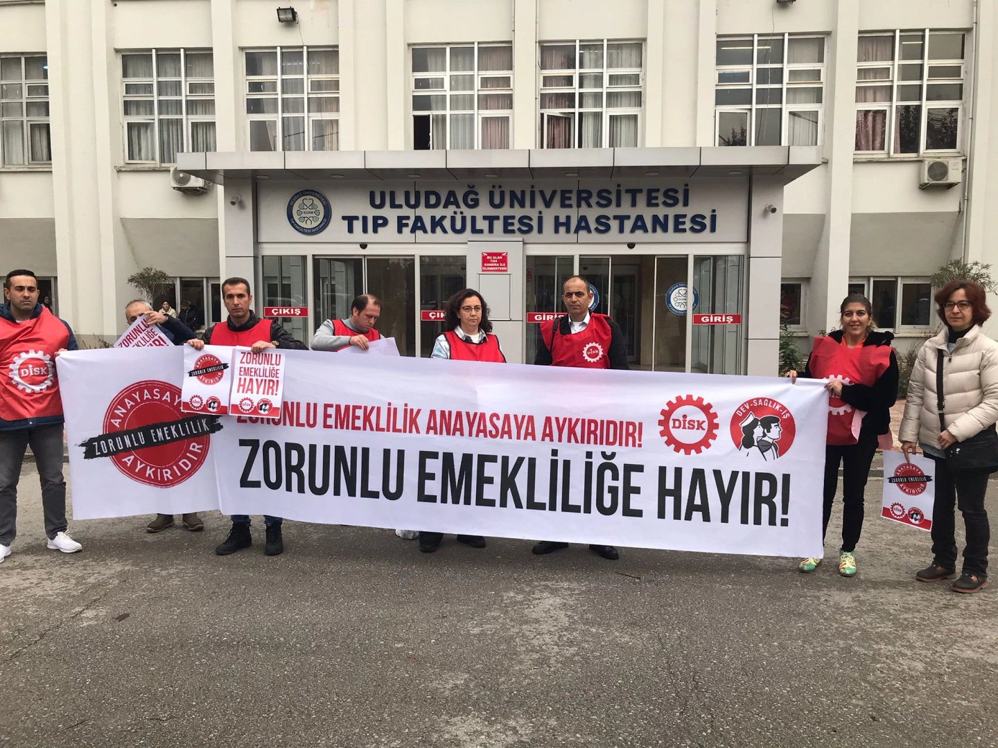 DİSK’e bağlı Dev-Sağlık-İş Uludağ Üniversitesi Tıp Fakültesi önünde, “Zorunlu emeklilik anayasaya aykırıdır, zorunlu emekliliğe hayır” demek için basın açıklaması gerçekleştirdi.
