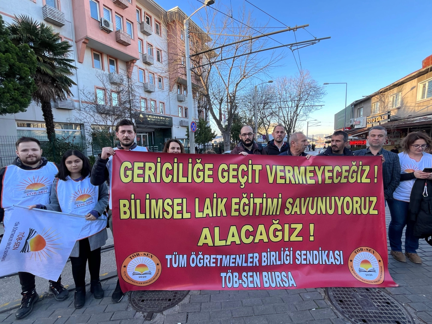 Bursa Milli Eğitim Müdürlüğü önünde toplanan TÖB-SEN üyeleri geçtiğimiz hafta Milli Eğitim Müdürlüğü önünde yapılmak istenen açıklamaya polis engelini kınayarak, "Eğitim dini tarikat ve cemaatlere teslim edilemez" dedi.