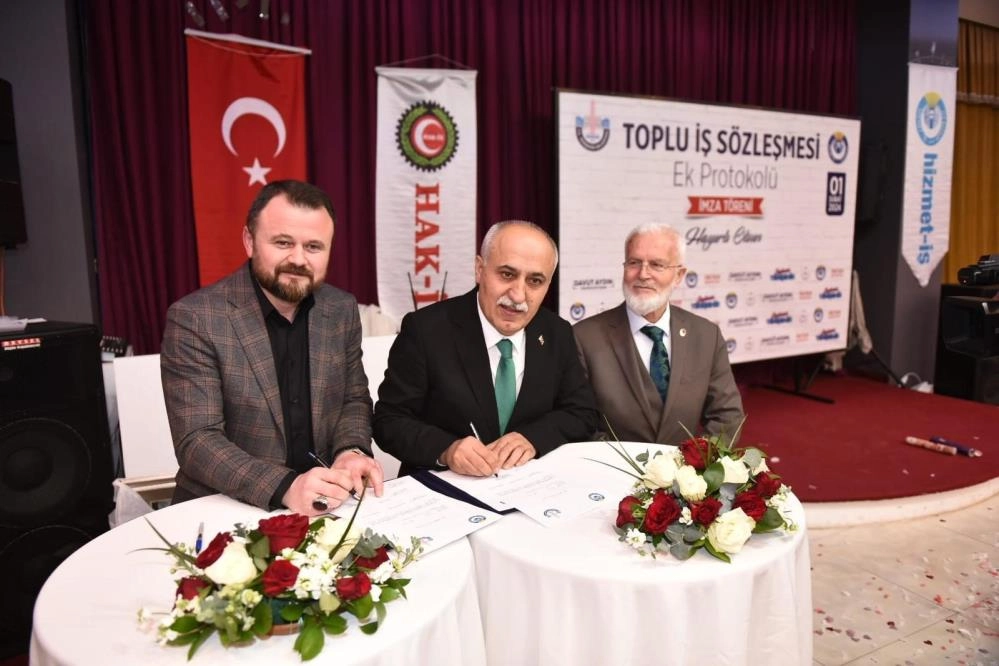 Yenişehir Belediyesi’nde yaklaşık 200 işçiyi kapsayan ek iş sözleşme protokolü, Belediye Başkanı Davut Aydın, HAK-İŞ Konfederasyonu Bursa İl Başkanı ve Hizmet-İş Bursa Şube Başkanı Mustafa Yavuz ile Mahalli İdareler ve İşverenleri Sendikası (MİS) Genel Sekreteri Mehmet Oruçöz tarafından imzalandı.