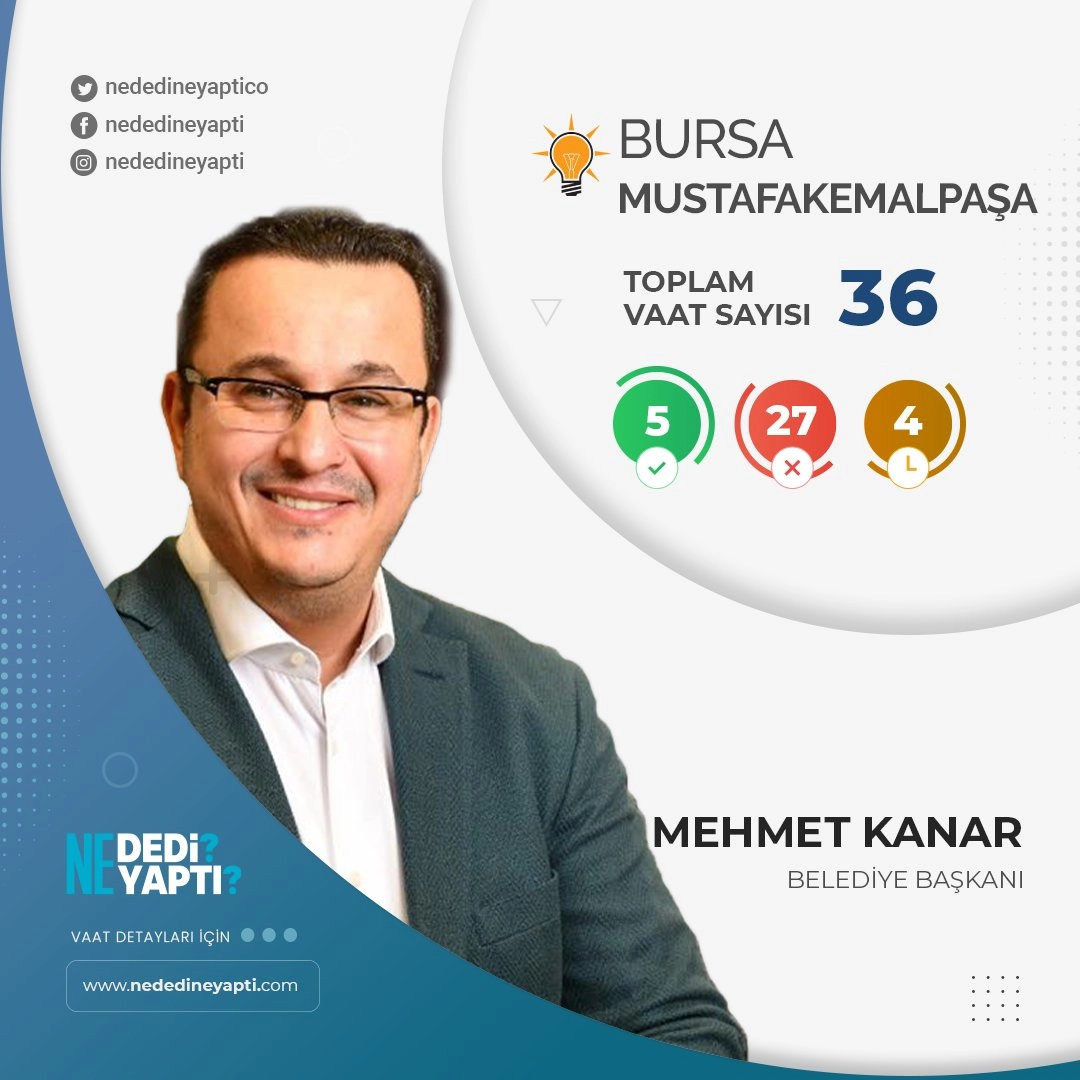 MEHMET KANAR'IN VAATLERİ NELERDİ?2019 yılında Mustafakemalpaşa Belediye Başkanı seçilen Kanar'ın, toplam 36 vaatte bulunurken bu vaatlerin 5'ini gerçekleştirip, 27'sini gerçekleştiremezken devam eden 4 projesi bulunuyor.