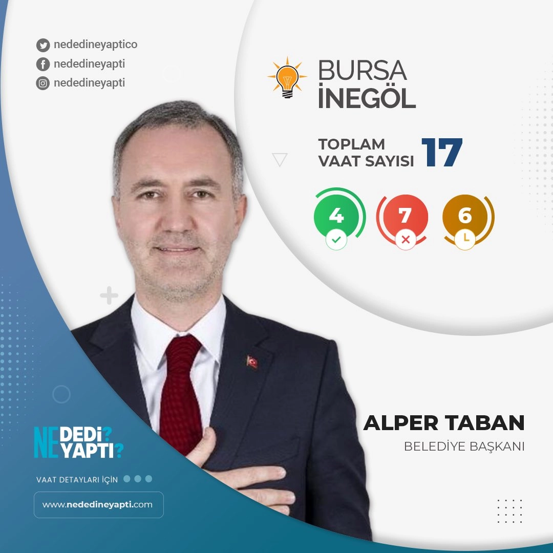 ALPER TABAN'IN VAATLERİ NELERDİ?2019 yılında İnegöl Belediye Başkanı seçilen Alper Taban'ın 17 vaadi bulunuyor. Vaatlerinden 4'ünü gerçekleştiren Taban'ın 6 projesi halen devam ediyor. Taban, vaatlerinden 7'sini ise gerçekleştirmedi.