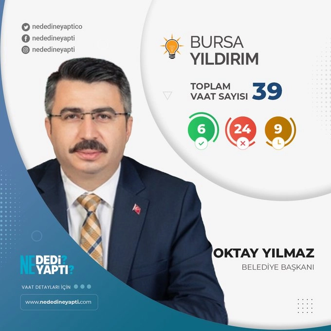 OKTAY YILMAZ'IN VAATLERİ NELERDİ?2019 yılında Yıldırım Belediye Başkanı seçilen Yılmaz’ın, toplam 39 vaatte bulunurken bu vaatlerin 6'sını gerçekleştirip, 24'ünü gerçekleştiremezken devam eden 9 projesi bulunuyor.