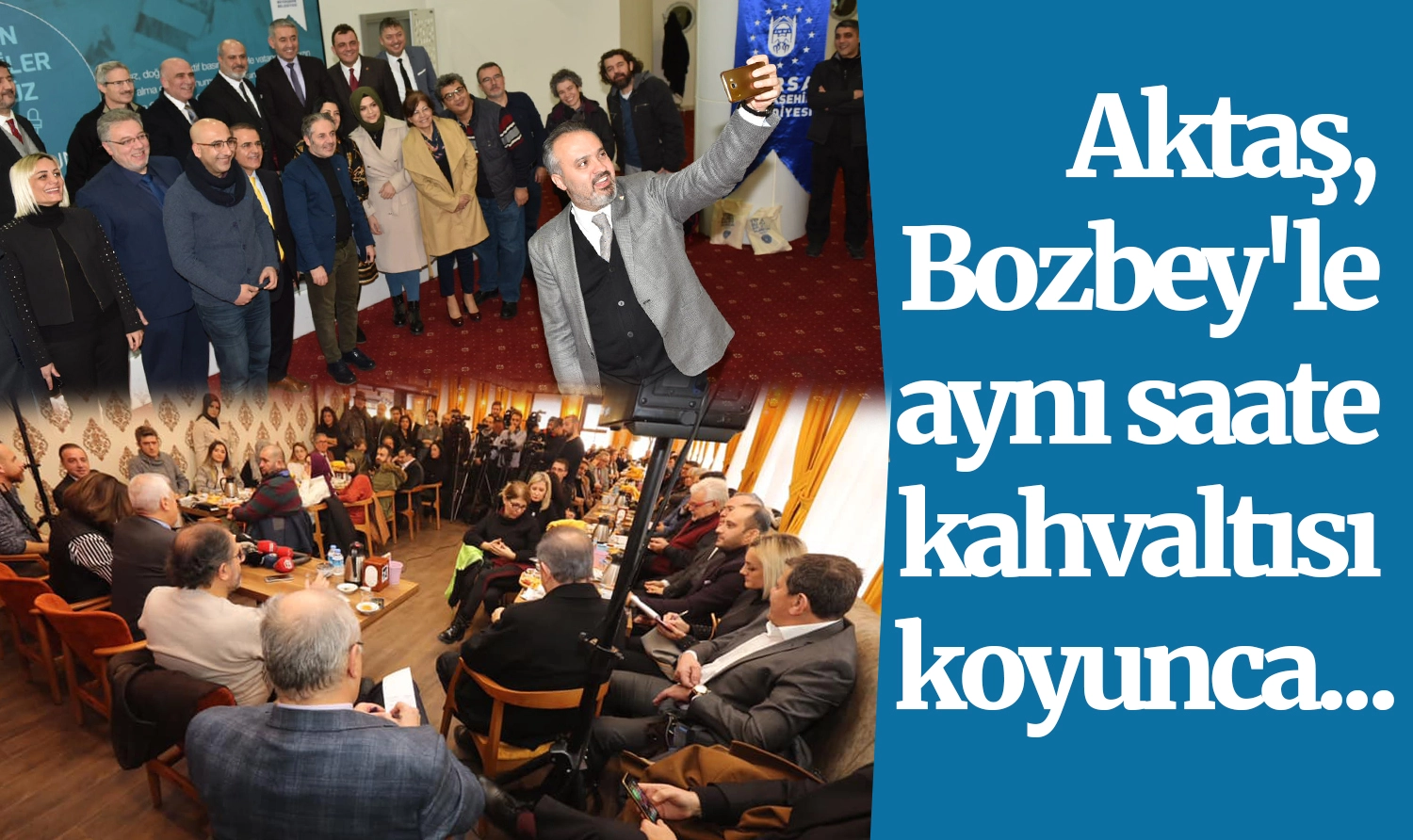 Bursa Büyükşehir Belediye Başkan adaylarının yarışı başladı. AKP'nin adayı Alinur Aktaş ile CHP adayı Mustafa Bozbey bugün 10 Ocak Çalışan Gazeteciler Günü dolayısıyla gazetecilerle kahvaltıda buluştular. Bozbey'le aynı saate kahvaltı koyan Alinur Aktaş'ın kahvaltısının boş geçtiği gözlendi.