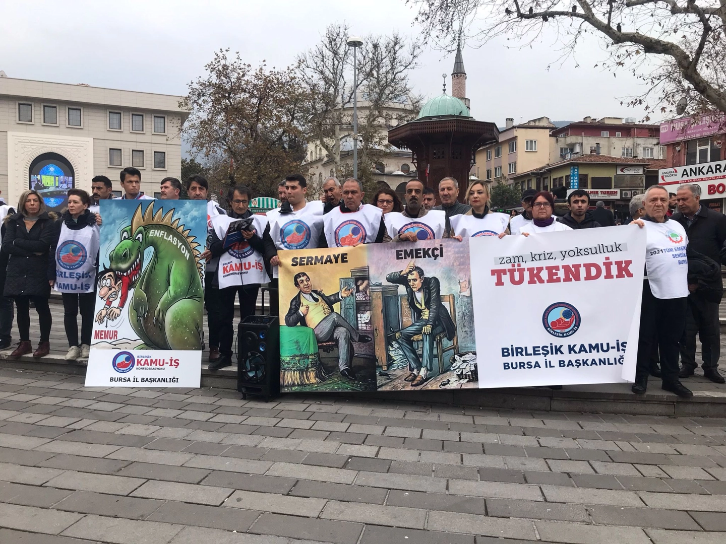 Fomara Meydanı’nda bir araya gelen Birleşik Kamu-İş üyeleri adına açıklamayı Birleşik Kamu-İş Bursa İl Başkanı Özkan Rona okudu.