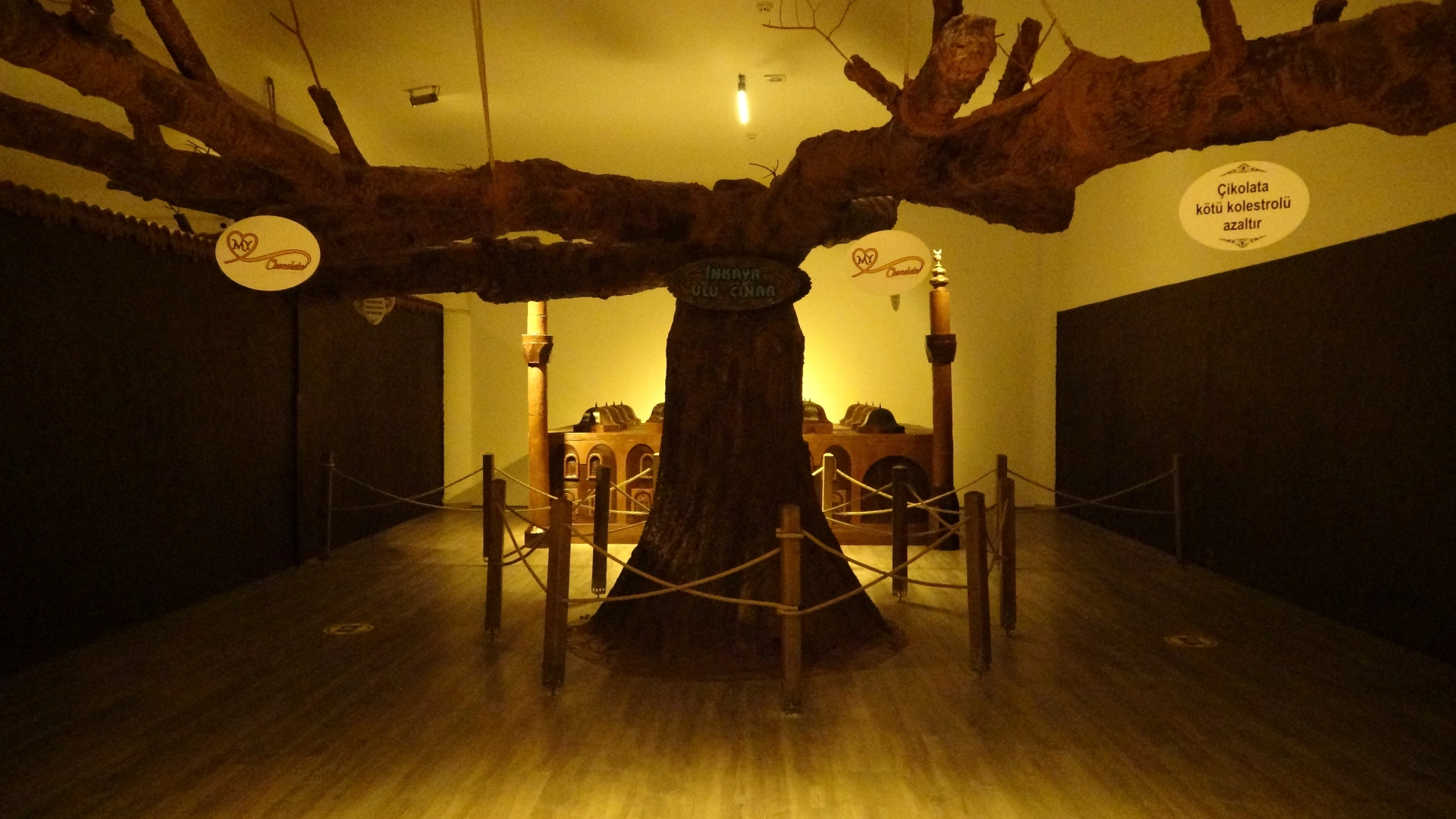 Bursa Çikolata Müzesi, kakao ve çikolatanın 5 bin yıllık geçmişine yolculuk yaptırırken, baş döndüren dizaynı ve tasarımıyla kendine hayran bırakıyor. Müzede Bursa'nın tarihi mekanlarının minyatürleri sergilenirken her eserde 10 tona yakın çikolata kullanıldı. Müzenin içerisine 600 yıllık geçmişi bulunan tarihi inkaya çınarını sığdıran Alihan Yiğit bu eserde 30 ton çikolata kullanıldığını ifade etti.