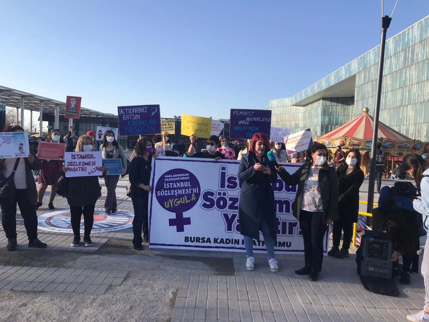 Bursa Kadın Platformu adına açıklamayı okuyan Tuğba Yalar, "Bir gece yarısı, kararnameyle, tek bir adamın kararı ile Meclis’e sormadan, kimseye sormadan, kadınlara sormadan İstanbul Sözleşmesi kaldırıldı. Bizi şiddetten koruyan, devlete bu şiddeti önle diyen sözleşmeden yangından mal kaçırır gibi çıkıldı. Kadınları dövme özgürlüğü isteyen erkeklere, Samsun’daki İbrahim Zarap gibilere, “eşit değilsiniz” diyerek bizi baskıya, şiddete açık hale getirenlere büyük bir hediye verildi. Ama biz nasıl ki yaşamaktan vazgeçemeyiz, İstanbul Sözleşmesi’nden de vazgeçmiyoruz" dedi.
