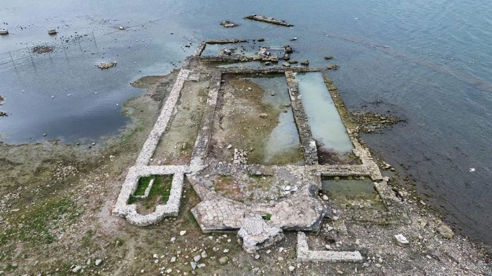 Marmara Bölgesi'nin en büyük gölü olan İznik Gölü'nde 10 yıl önce 2 metre derinlikte keşfedilen 2 bin yıllık bazilika, kuraklıkla birlikte artık tamamen su yüzeyine çıktı. Üzerinde ördeklerin gezdiği bazilika, dron ile havadan görüntülendi.