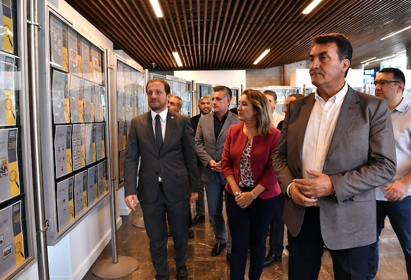 Konuşmaların ardından protokol üyeleri ile serginin açılış kurdelasını kesip pulları tek tek inceleyen Dündar, bir gün durup daha sonra imha edilecek özel gün damgasından da vurdu.